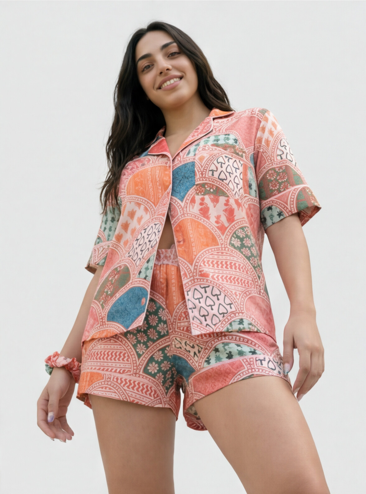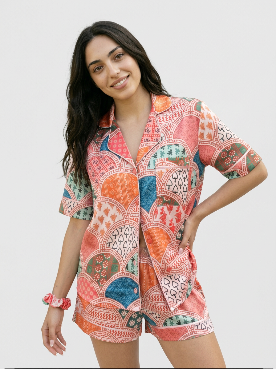 Pyjama 2 pièces satin mat, imprimé patchwork coloré bohème orange, rose et vert, manches courtes et short